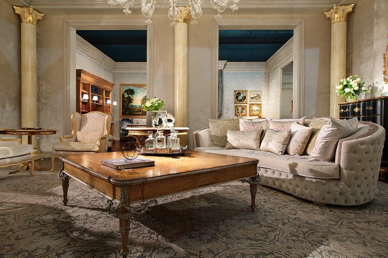 Столовые, гостиные, спальни, кабинеты — коллекции с тончайшей резьбой, сложностью пропорций, резьбой и золочением.